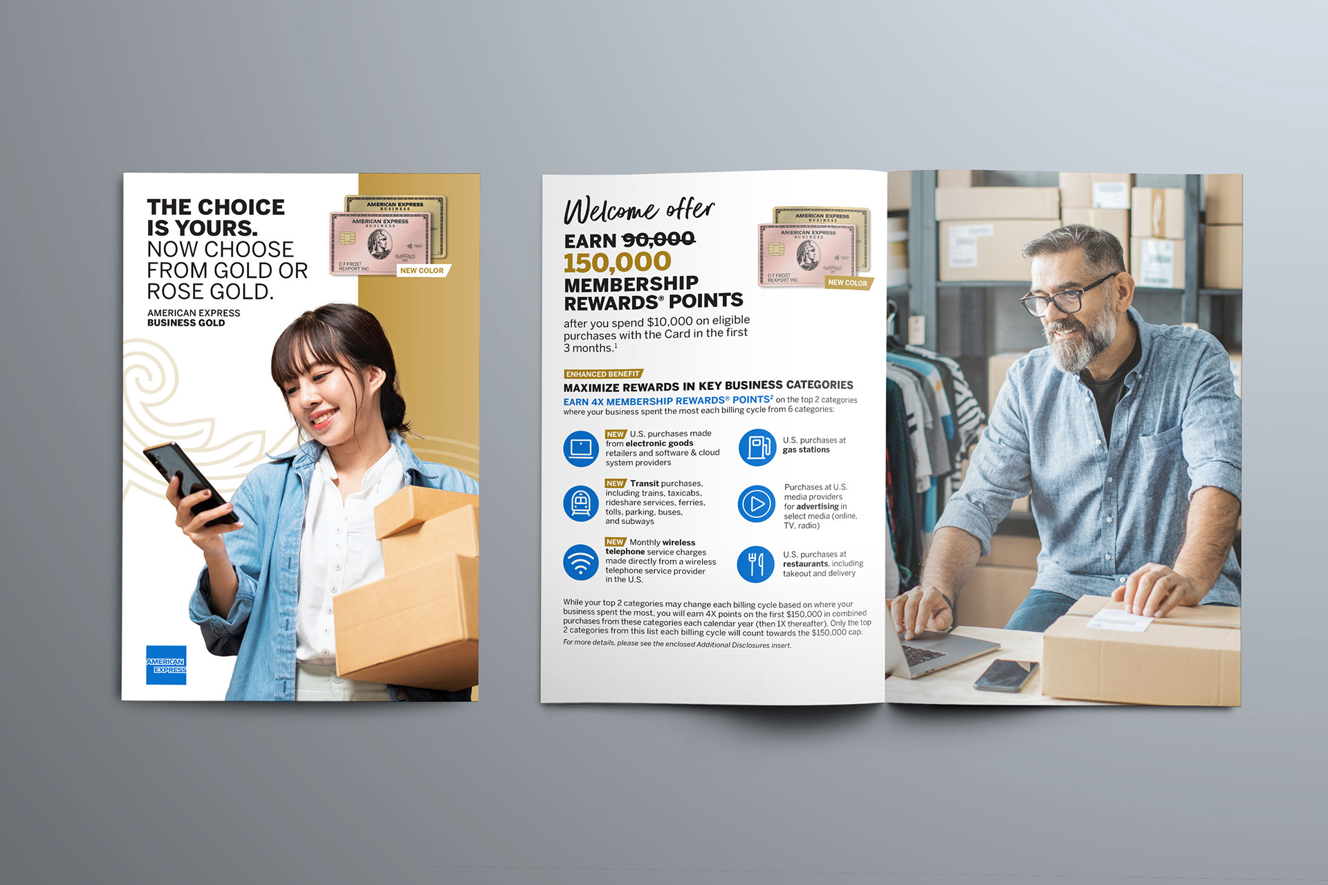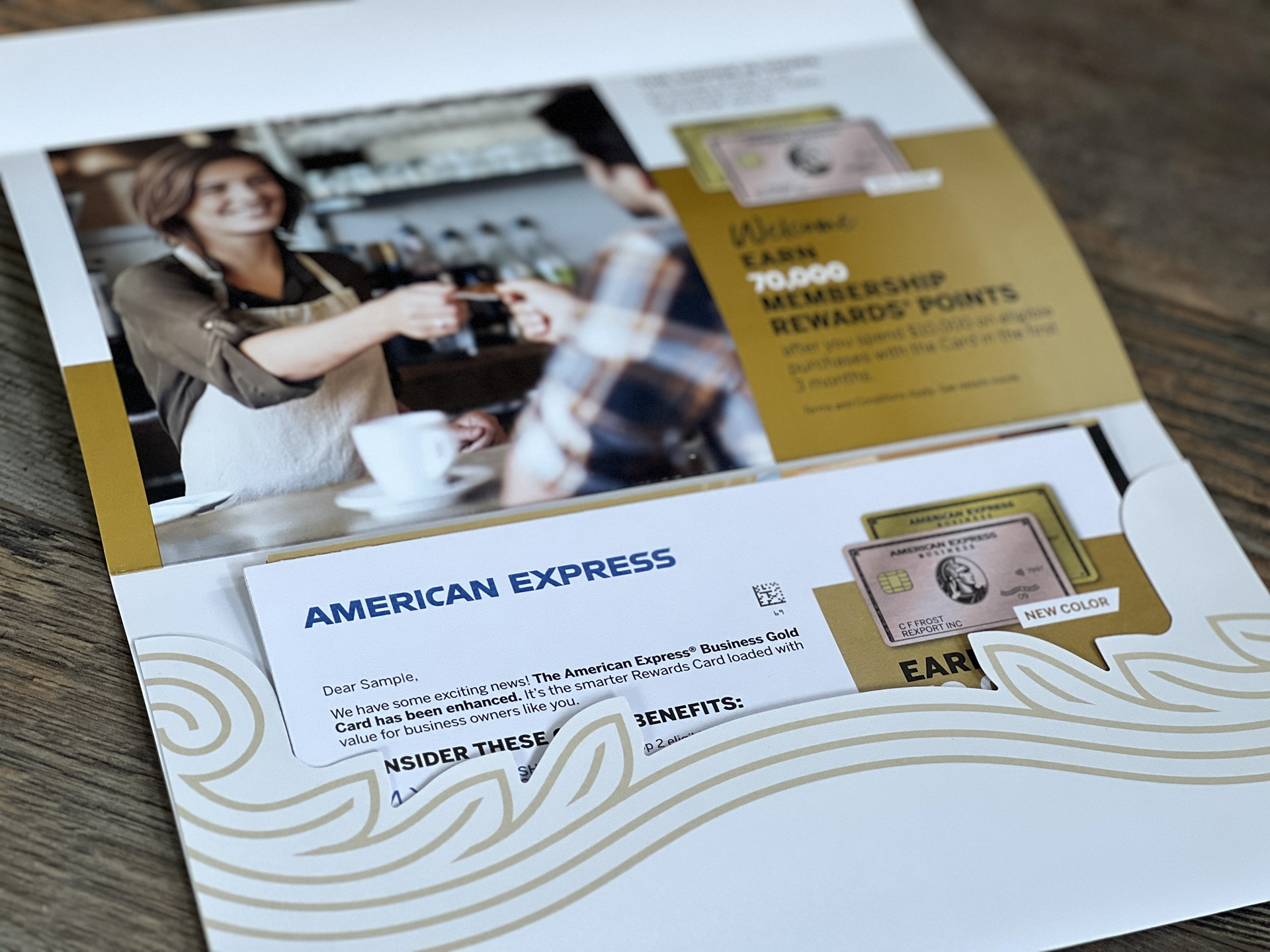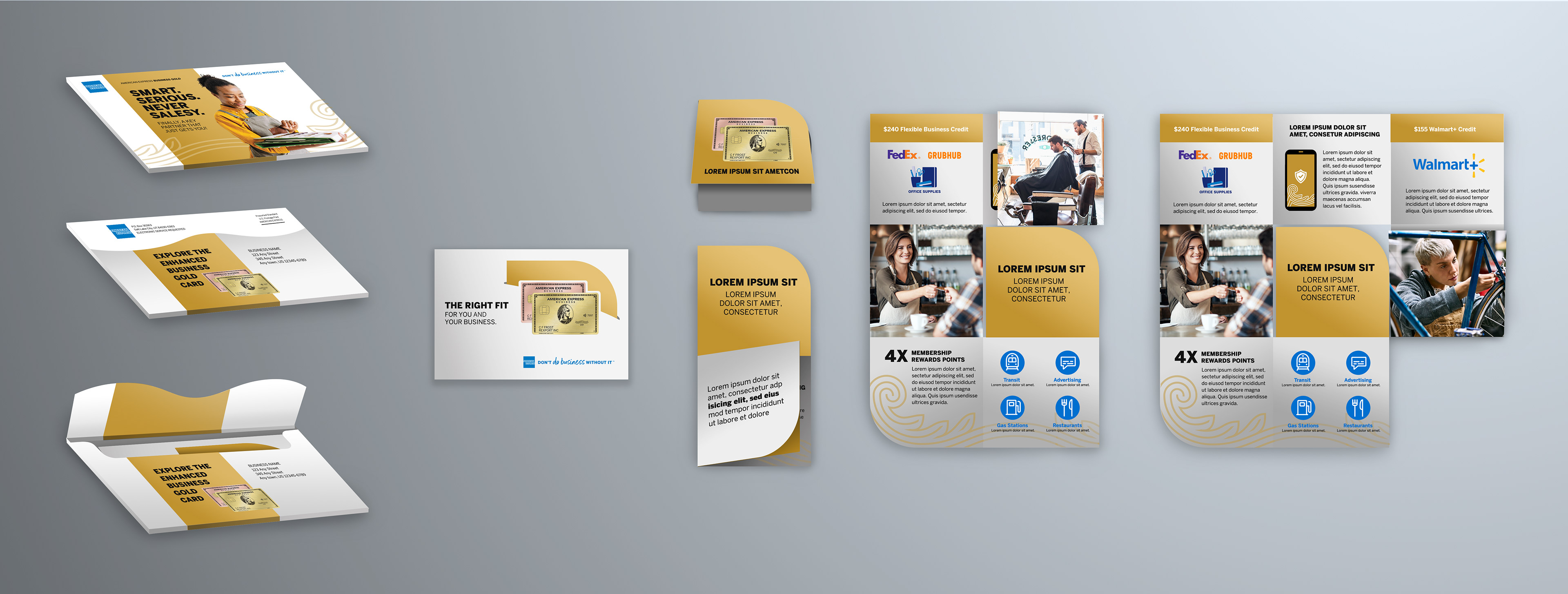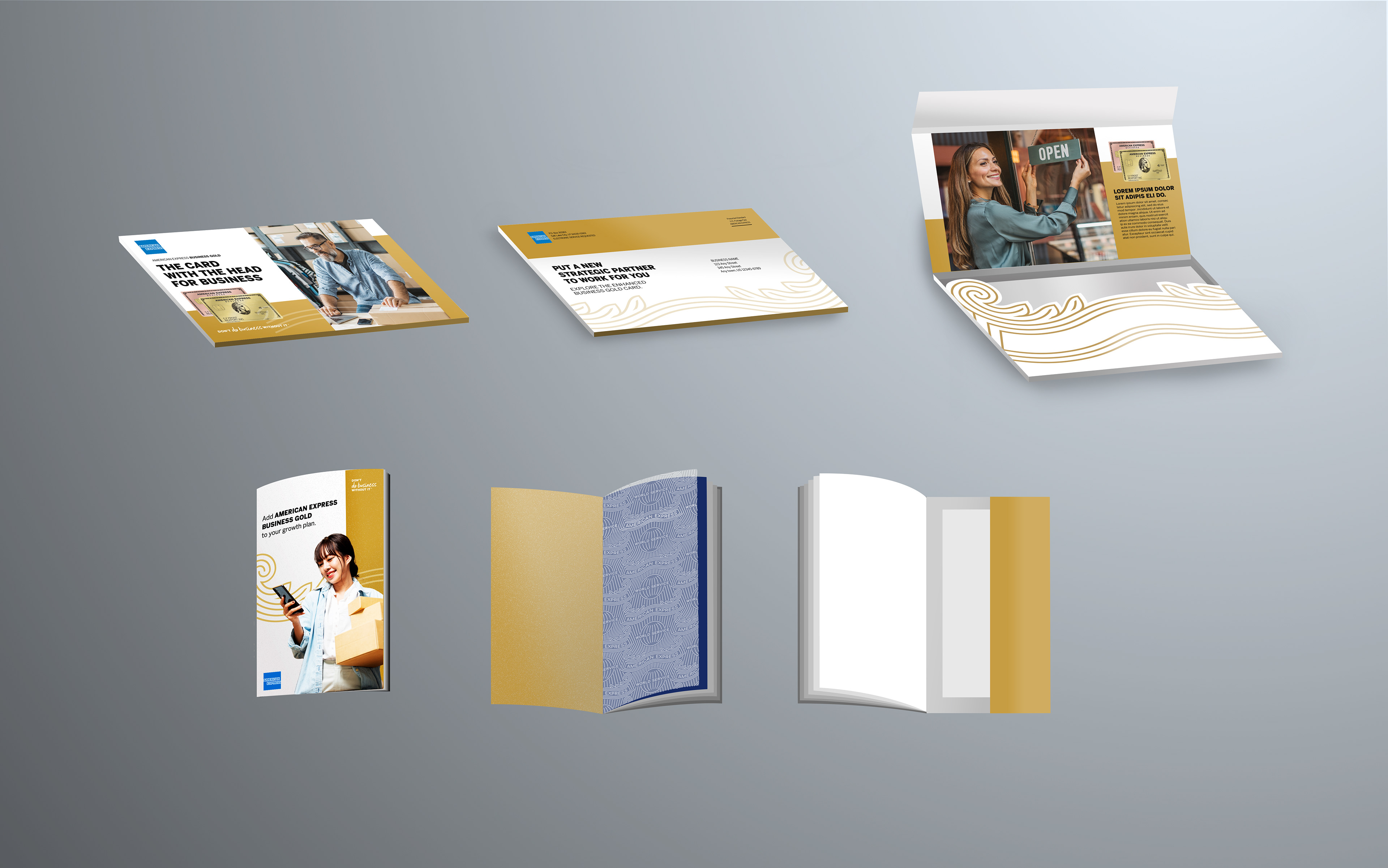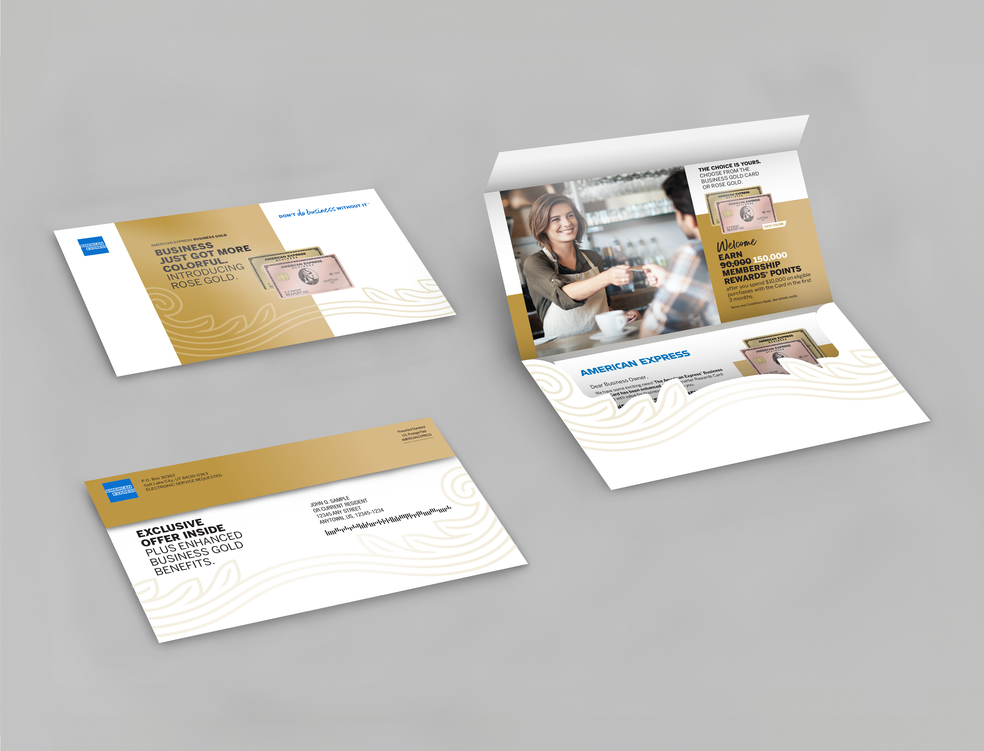 The second option utilized a curved flap on the outer envelope that mimicked the shape of the American Express ribbon. The snake fold brochure would tuck inside a card and, when opened, would reveal the enhanced benefits and features of the Business Gold Card while highlighting new images.