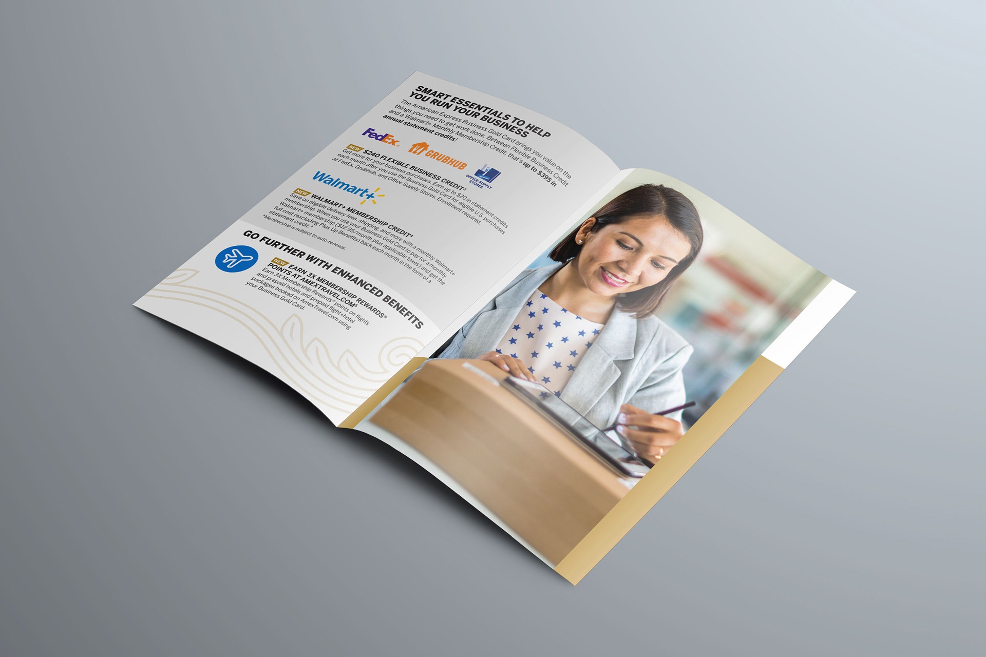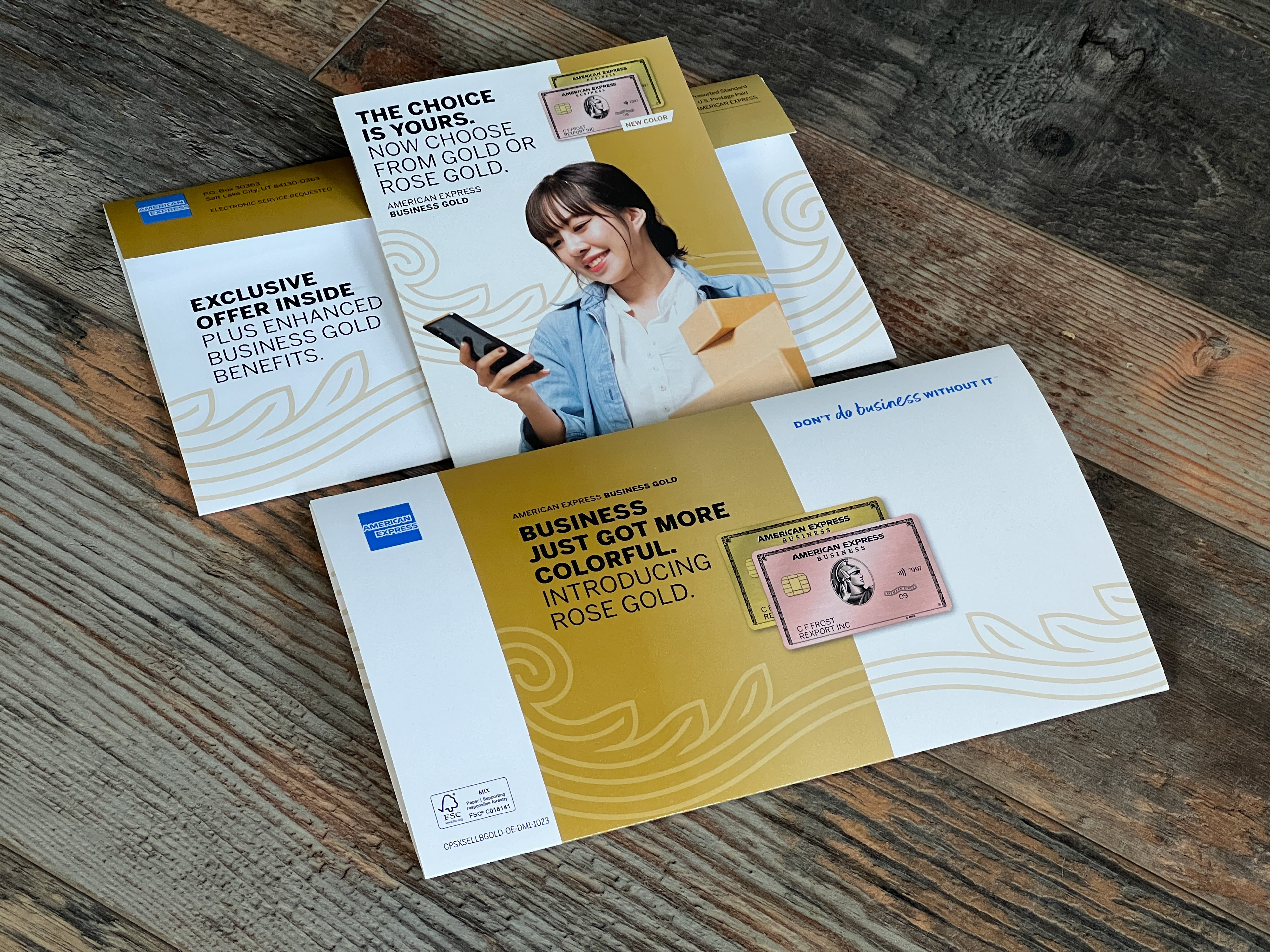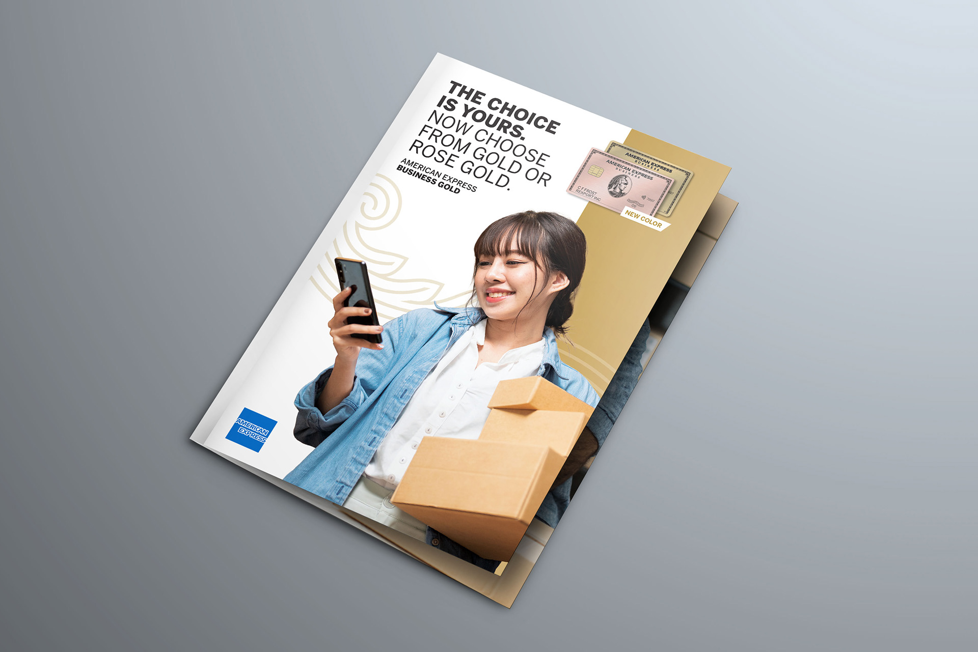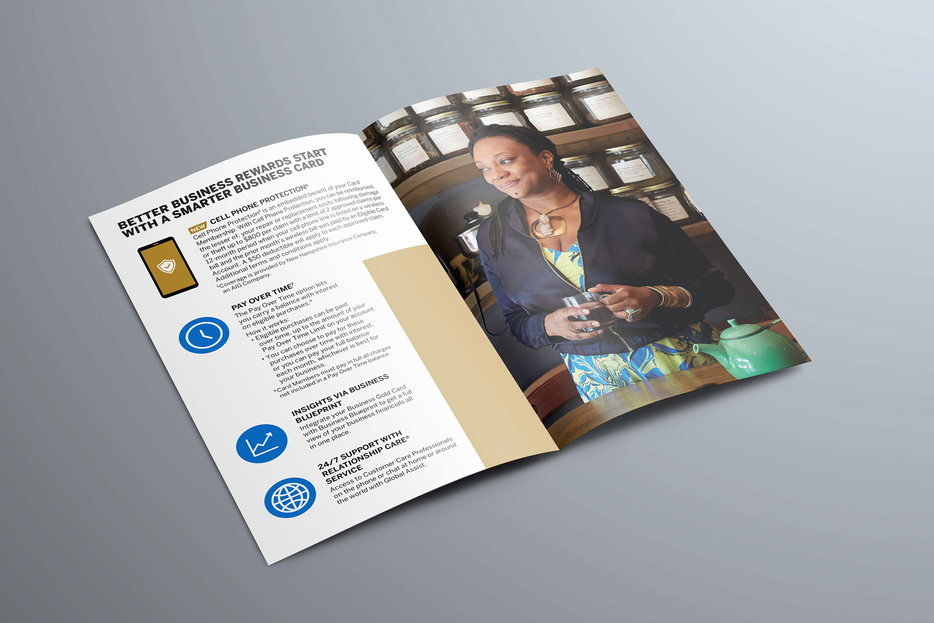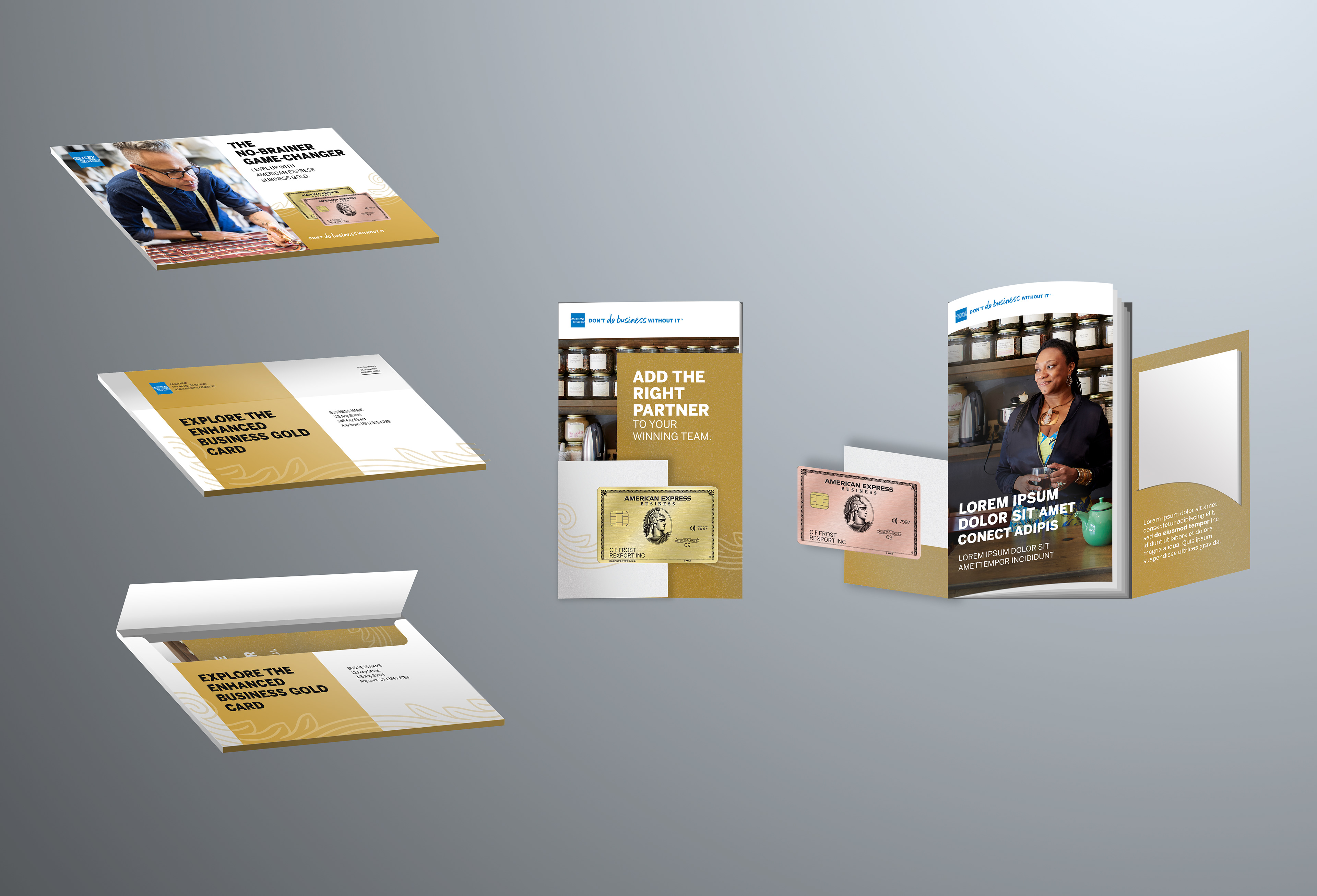 The second option utilized a curved flap on the outer envelope that mimicked the shape of the American Express ribbon. The snake fold brochure would tuck inside a card and, when opened, would reveal the enhanced benefits and features of the Business Gold Card while highlighting new images.